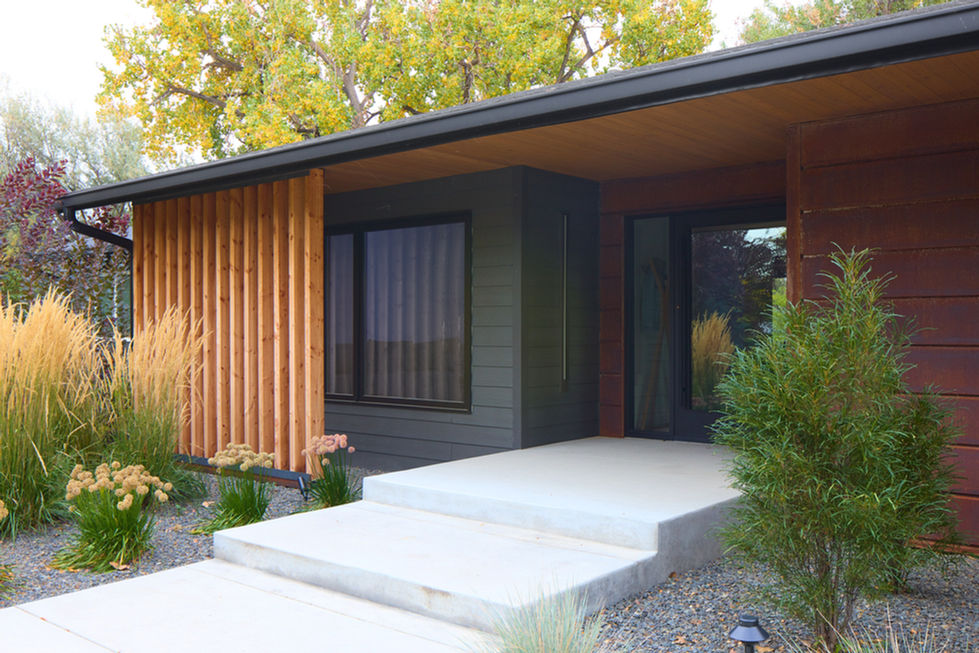 The remodel of a 90's ranch house sits on a fantastic site on the West end of Billings. The property is 3 acres and is nestled into a bend in canyon creek that boarders the lot on 3 sides. This client is a contractor and wanted his house to be much more open and modern, he really emphasized that they wanted a black house. The entire exterior of the house is black with the exception of wood accents at two locations, the main entry and back patio.